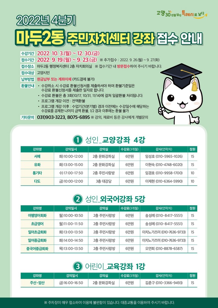 마두2동 주민자치센터 문화강좌 접수는 9월 19일(월)부터 9월 23일(금) 매일 오전 10시부터 17시(12시~13시 제외)까지 마두2동 행정복지센터 2층에서 선착순으로 실시한다.
