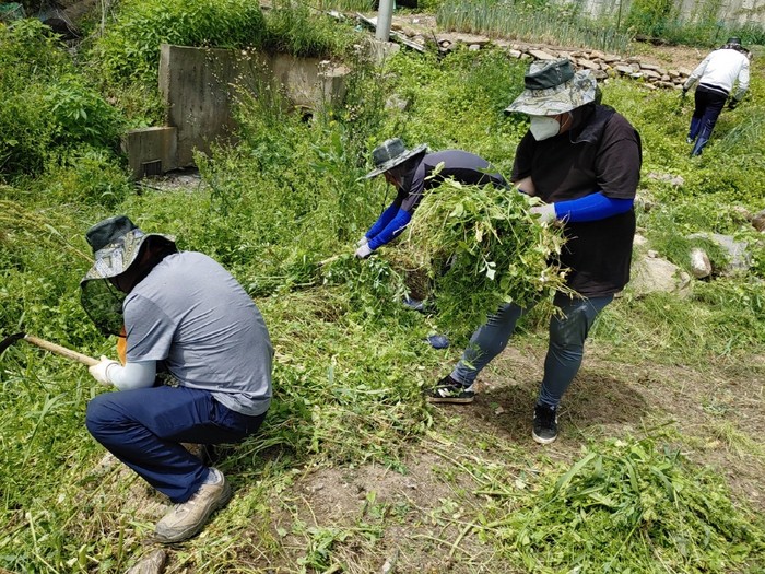 [부자동네타임즈 김인수기자] 고양시에서 생태하천을 보호하기 위해 중장년들과 청년들이 함께 구슬땀을 흘리고 있다. 이들은 시가 진행하는 공공일자리 사업 참여자들이다.