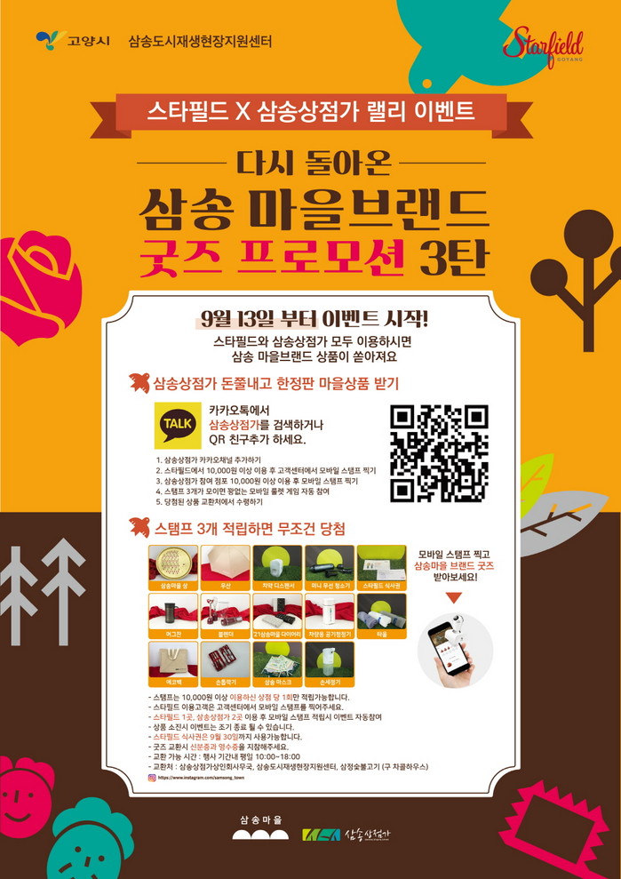 발행된 이벤트 응모권을 가지고 교환처(삼송상점가 상인회 사무실, 삼송도시재생현장지원센터, 삼정숯불고기)에 방문하면 삼송마을 한정판 브랜드 상품을 받을 수 있다. 상품으로는 스타필드 식사권, 우산, 에코백 등 다양한 물품이 준비되어 있다.