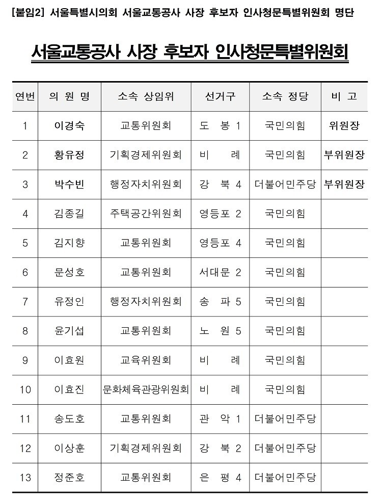 이번 특별위원회는 총 13인의 특별위원으로 구성되었으며, 오는 3월 24일(화) 오전 10시 서울교통공사 사장 후보자(김태균, 前 서울특별시 행정1부시장)에 대한 인사청문회를 개최할 예정이다.