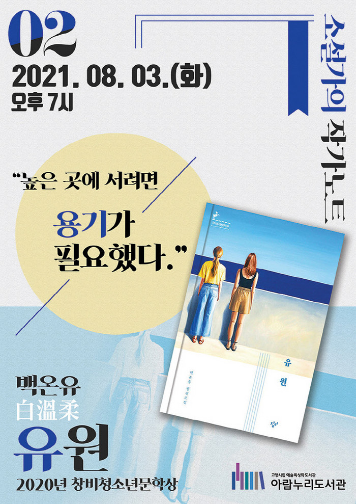 [부자동네타임즈 김인수기자] 고양시 아람누리도서관은 오는 8월 3일(화) 오후 7시, 2020년 창비청소년문학상 수상작가 백온유 작가를 초대해 두 번째 소설가의 작가노트(온라인)를 진행한다.