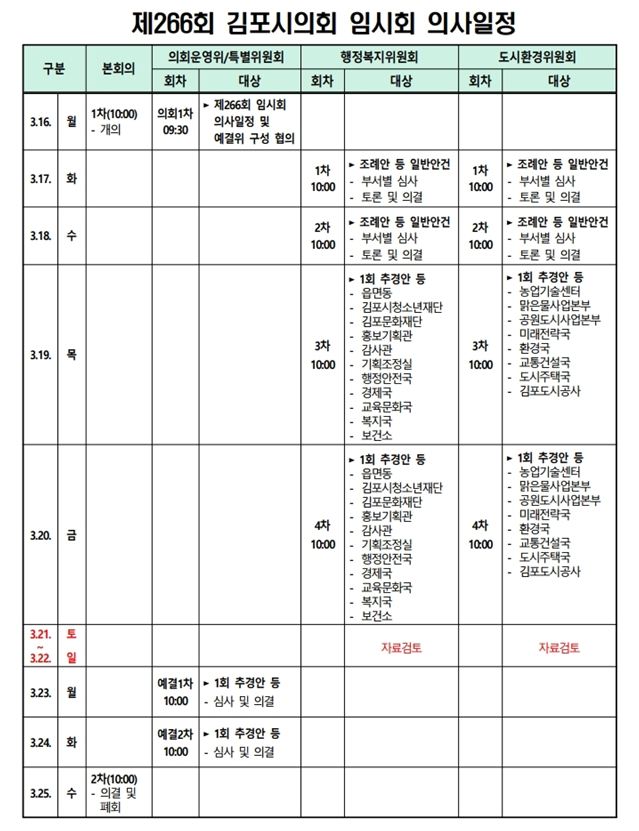 세부 일정으로는 3월 17일부터 18일까지 각 상임위원회별로 조례안과 기타안 등 일반안건에 대한 심의가 진행되며, 해당 안건은 상임위원회 논의를 거쳐 본회의에서 처리된다. 이어 3월 19일부터 24일까지는 2026년도 제1회 추가경정예산안에 대한 부서별 검토가 진행되며, 예산안은 상임위원회와 예산결산특별위원회의 심의를 거쳐 본회의에서 최종 의결될 예정이다.