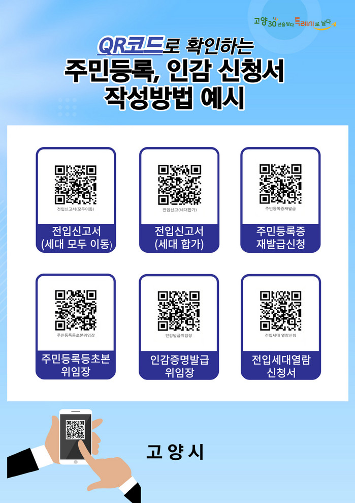 이에 시는 장소에 구애받지 않고 민원서식 작성견본을 확인할 수 있도록 민원인이 주로 이용하는 전입신고서, 주민등록등·초본 위임장, 인감증명서 발급 위임장 등 총 6종의 QR코드를 제작하여 44개 동 행정복지센터에 배부했다.