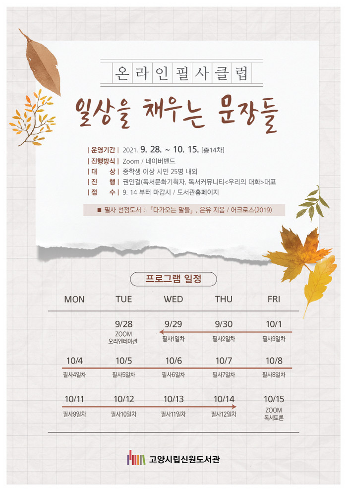 [부자동네타임즈 김인수기자] 고양시 신원도서관이 오는 28일(화)부터 10월 15일(금)까지 매일 14일간 온라인 필사클럽 ‘일상을 채우는 문장들’을 운영한다.