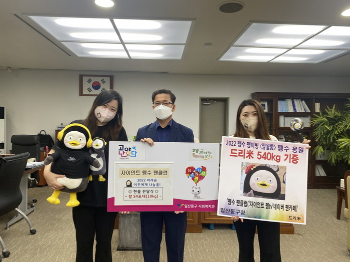 [부자동네타임즈 김인수기자] 고양특례시 일산동구(구청장 방경돈)는 지난 29일 ‘고양난다(복지나눔 1촌 맺기)’사업의 일환으로 ‘자이언트 펭TV’ 네이버 펭수 팬클럽으로부터 쌀 540kg(10kg 54포)를 전달 받았다.