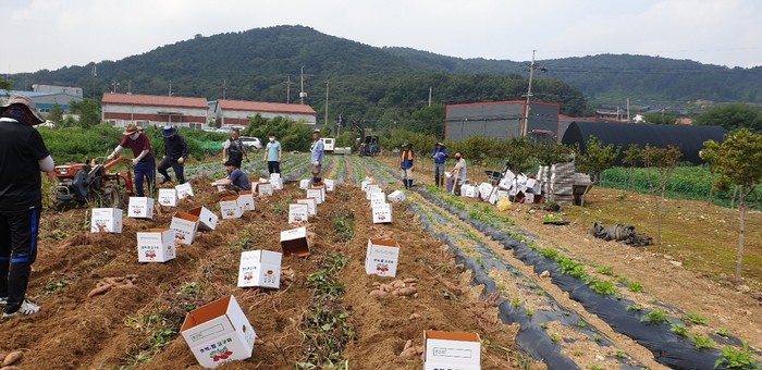 사리현동 소재 주민자치위원회 텃밭에서 수확한 100여 상자의 고구마는 관내 경로당과 독거 어르신 등에게 전달할 예정이다.
