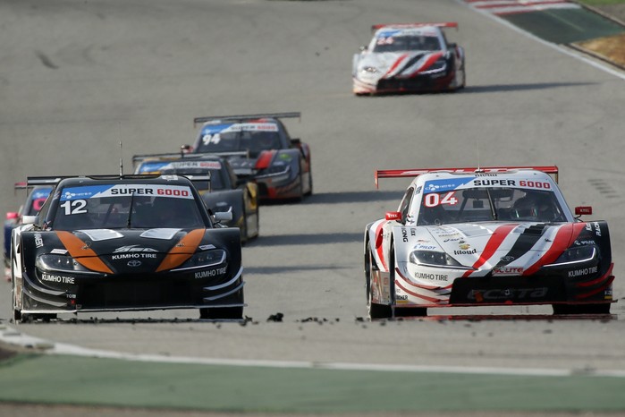 [사진설명] 엑스타 레이싱의 정의철(04번)이 지난 25일 인제스피디움에서 열린 2020 CJ대한통운 슈퍼레이스 챔피언십 6라운드 슈퍼 6000 클래스 결승에서 황진우(12번)를 제치고 1위로 올라서고 있다.