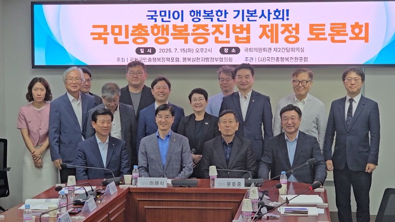 국민의 삶의 질과 행복을 국정 운영의 중심 가치로 삼기 위한 ‘국민총행복증진법’ 제정 논의를 위한 공개 토론회가 7월 15일 서울 여의도 국회의원회관에서 열렸다. 이날 토론회는 더불어민주당 윤호중 의원과 국민총행복정책포럼이 공동 주최했으며, 학계·정부·지자체 인사들이 대거 참여해 정책 방향을 공유하고 법제화 필요성을 강조했다.