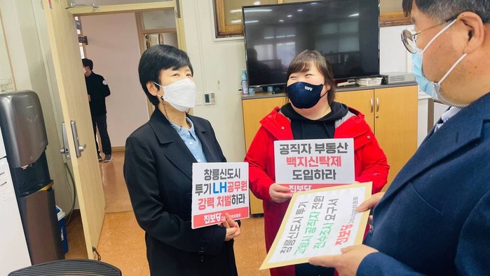 전민선 부위원장은 “최근 자고 일어나면 솟아있는 집값에 자기 집 마련은 엄두도 내지 못하는 서민들은 이번일로 절망에 빠졌습니다. 서민들의 주거안정을 실현해야 할 LH가 공공의 개발정보를 빼내어 앞장서서 투기꾼으로 둔갑했습니다. 도대체 제 3기 신도시는 누구를 위한 것입니까?” 라며 LH의 투기의혹에 대해 질타했다.