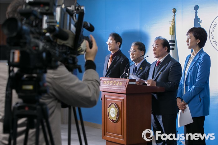 | △ 30일 오전 서울 여의도 국회 정론관에서 조희연(왼쪽부터) 서울시교육감, 이재정 경기도교육감, 장휘국 전국시도교육감협의회 회장, 유은혜 새정치민주연합 의원이 누리과정 예산 편성 문제와 관련해 기자회견을 하고 있다. <사진제공=포커스뉴스> |