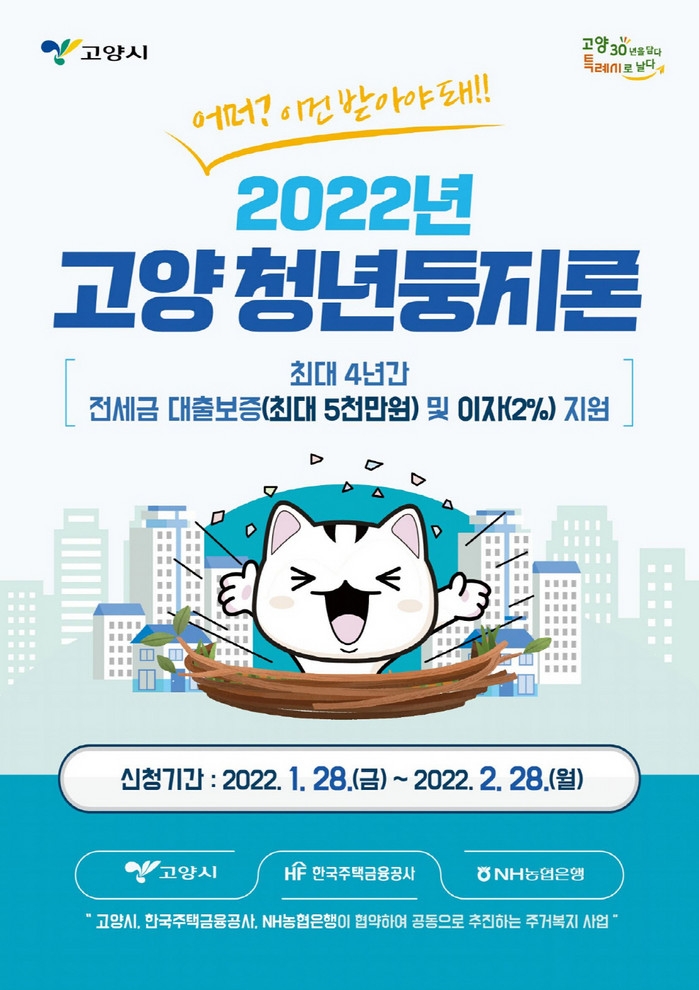 올해부터 청년들의 전세금을 지원하는 ‘고양 청년둥지론’이 신규 추진된다. 지원대상은 고양시 만 19세~39세 무주택 청년가구 세대주로, 5천만 원이내의 대출보증 및 연 이자 2%(연 100만원 한도)를 지원한다. 총 200가구를 대상으로 이달 말부터 대상자를 모집할 계획이다. 월세 주거지원으로는 한시 특별지원을 운영, 코로나19 장기화로 어려움을 겪는 청년을 대상으로 월 20만원씩 최대 12개월간 지원하며 오는 6월부터 대상자를 모집한다.