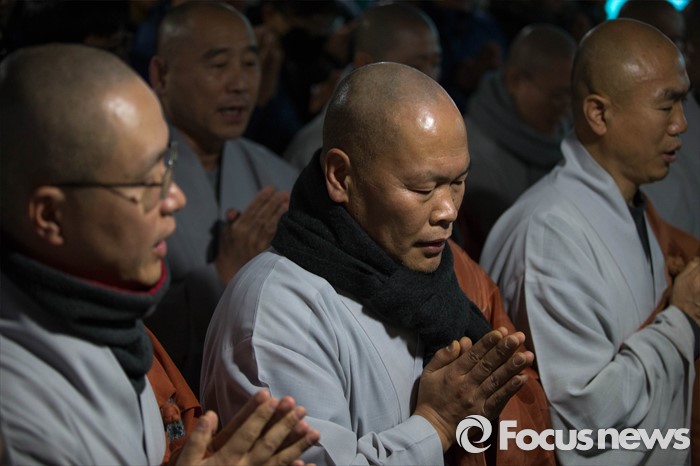 | △ 경찰이 한상균 위원장을 체포하겠다고 통보한 9일 오후 서울 종로구 조계사에서 스님들과 관계자들이 경찰병력의 진입을 막기 위해 관음전 입구에 인간벽을 세우고 불경을 외우고 있다. <사진제공=포커스뉴스> |