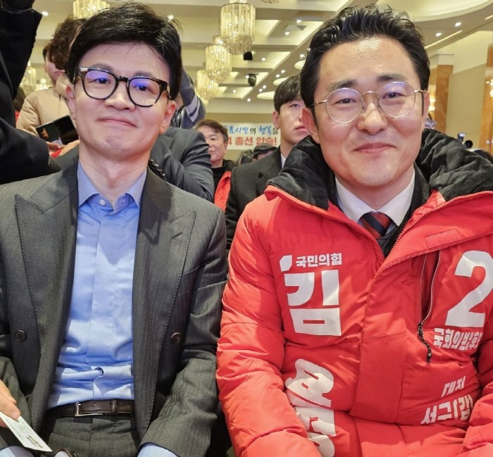 | ▲국민의힘 김용경 대전 서구갑 후보(오른쪽)가 국민의힘 한동훈 비대위원장(왼쪽)과 사진을 찍고 있다. |