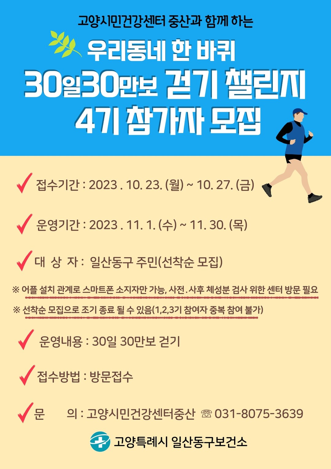 참여를 원하는 사업체 및 지역 주민은 10월 23일(월)부터 센터에 방문해 신청하면 된다. 자세한 사항은 고양시민건강센터 중산(031-8075-3639)으로 문의하면 된다.