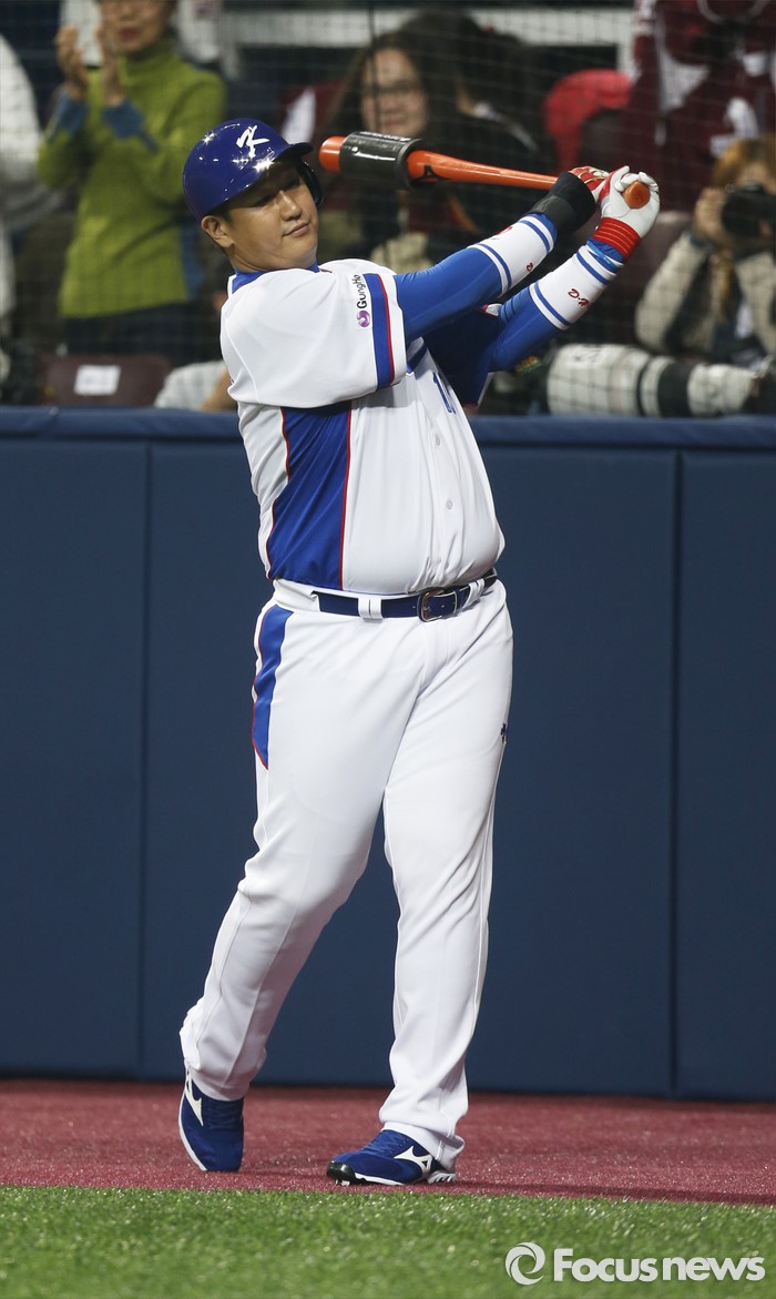 | △ 4일 오후 서울 구로구 고척스카이돔에서 열린 2015 서울 슈퍼시리즈 대한민국과 쿠바의 경기 7회말 상황에서 대한민국 대표 이대호가 나성범과 교체된 후 타석에 들어서기 전 몸을 풀고 있다. 오장환 기자 ohzzang@focus.kr |