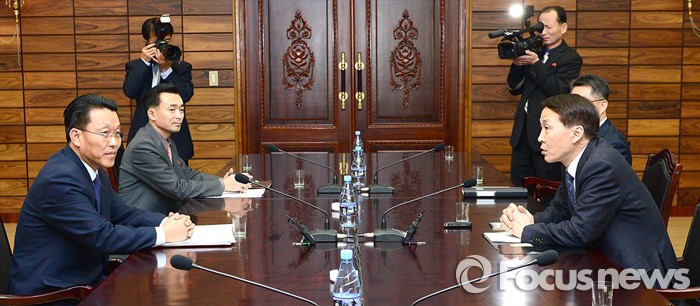 | △ 지난달 26일 판문점 통일각에서 김기웅(오른쪽) 통일부 남북회담본부장과 황철 북한 조국평화통일위원회 서기국 부장이 남북 당국회담 준비를 위한 실무접촉을 하고 있다. <사진제공=통일부> |