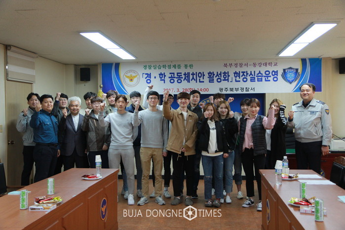광주북부경찰서(서장 임광문)는 '17년 3월 28일 오후 청사 소회의실에서 최윤석 생활안전과장을 비롯한 동강대학교 경찰경호학과 학과장 나현태 교수 및 학생 16명이 참석한 가운데 경찰실습 학점제 프로그램 중 하나인 이론 수업을 실시하고, 선배 경찰관과 자유로운 대화 시간을 통해 경찰채용과 업무에 관한 이야기를 나누었다.