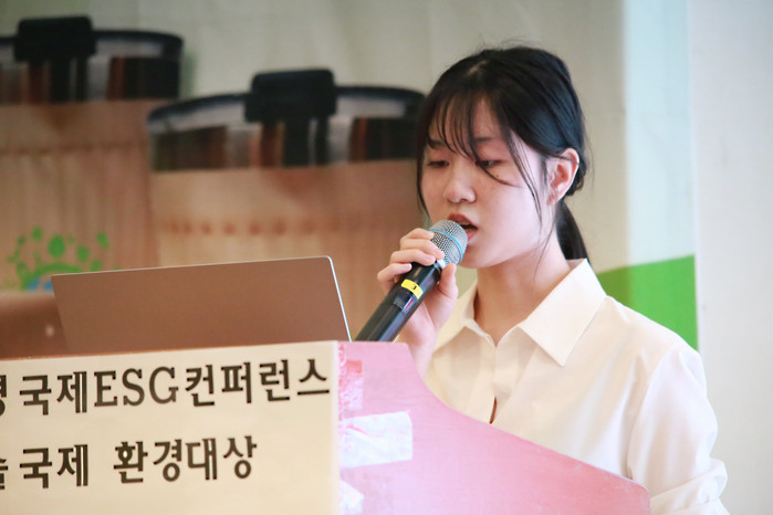 [사진설명] 대전외국인국제학교 윤현정학생 환경에 관한 발표를 하고 있다.