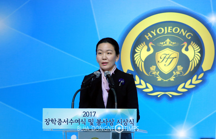 5일 오후 경기도 가평 청심국제청소련수련원 대강당에서 열린 ‘재단법인 효정세계평화재단 2017 장학증서 수여식 및 봉사상 시상식’에서 문연아 이사장이 환영사를 하고 있다. 이날 행사에는 전체 장학생을 대표하여 한국, 미국, 영국, 독일, 프랑스, 오스트리아, 브라질, 멕시코, 니카라과, 일본, 대만, 네팔, 말레이시아, 호주, 뉴질랜드, 솔로몬 제도, 러시아, 루마니아, 시리아, 이스라엘, 가나, 르완다, 우간다, 잠비아, 카메룬 등 전 세계에서 88개국 800여명의 학생수여자들이 참석했다. 2017.02.05.(사진=재단법인 효정세계평화재단 제공)