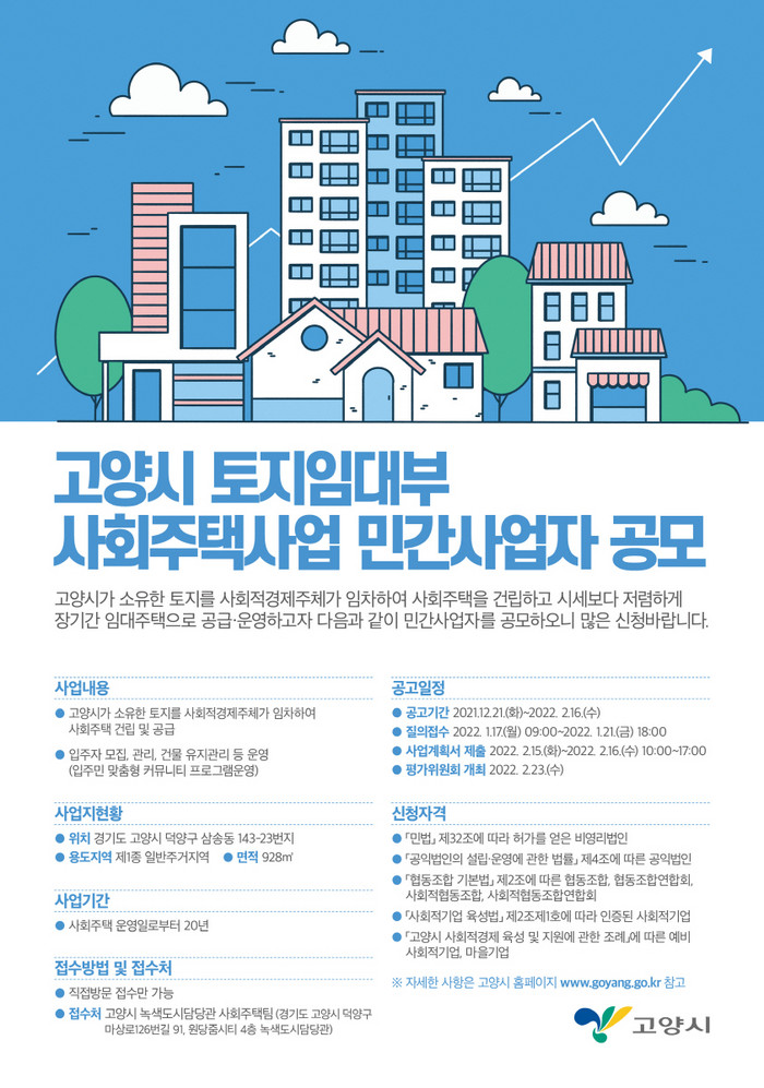 [부자동네타임즈 김인수기자] 고양시가 청년 및 신혼부부 등 주거 취약계층의 주거안정을 위해 덕양구 삼송동 시유지에 제2호 사회주택 12세대를 추가로 공급할 계획이다. 이에 따라 사회주택 건립.운영을 위한 민간사업자를 공모한다고 23일 밝혔다.