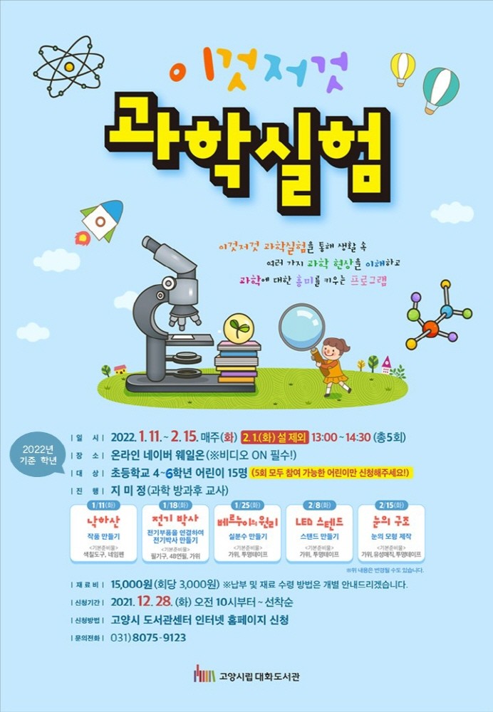 [부자동네타임즈 김인수기자] 고양시 대화도서관이 겨울방학을 맞아 어린이들을 위한 프로그램 ‘이것저것 과학실험’을 1월 11일부터 2월 15일까지 운영한다.
