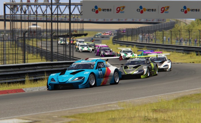 [사진설명] 김규민(맨 왼쪽, 55번)과 김영찬(04번)이 지난 30일 열린 CJ대한통운 e슈퍼레이스 시리즈 정규리그 6라운드 결승전에서 1위 자리를 놓고 접전을 벌이고 있다.