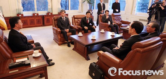 | △ 11일 오전 서울 종로구 남북회담본부에서 홍용표(맨 왼쪽) 통일부 장관이 남북당국회담 대표단을 격려하고 있다. <사진제공=포커스뉴스> |