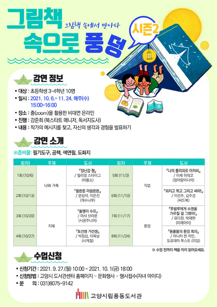 프로그램 신청은 9월 27일(월) 오전 10시부터 고양시도서관센터 홈페이지를 통해서 할 수 있으며 선착순 10명까지 가능하다.