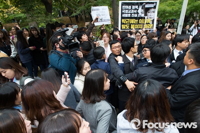 (서울=포커스뉴스) 29일 오후 서울 이화여자대학교 학생들이 박근혜 대통령의 교내 방문을 반대하는 집회를 벌이다 경찰과 충돌했다.