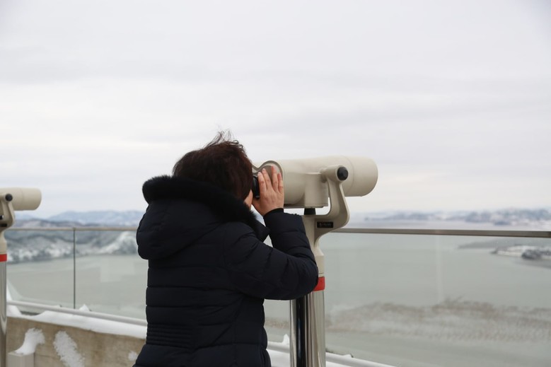 | ▲'온리피스 콘퍼런스' 참석자가 조강전망대에서 망원경을 통해 북한 개풍군 일대를 바라보고 있다. |