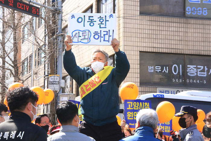 주민들은 시청사 앞 정문에 내건 이동환 고양시장 사진에 계란을 투척하며 신청사를 일산 백석동 요진업무 빌딩으로 이전을 발표한 이 시장은 사퇴하라고 촉구했다.