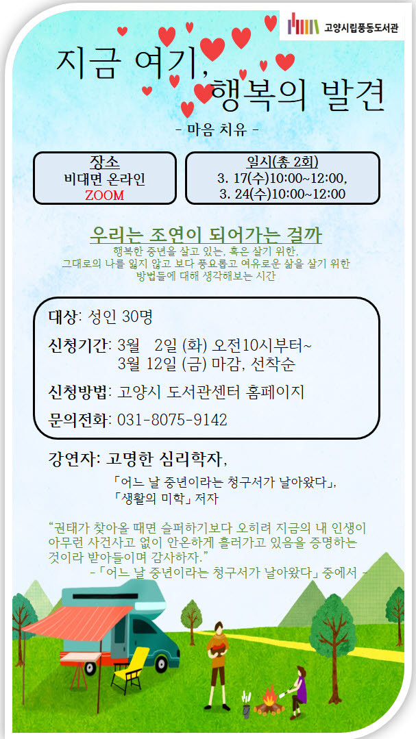 ‘지금 여기, 행복의 발견’ 프로그램과 관련된 문의는 고양시 풍동도서관로 하면 된다.