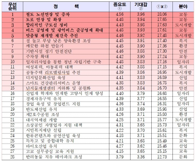 주요 정책사업에 대해 시민들이 보는 중요도와 기대감을 4사분면에 표시한 매트릭스 분석에 따르면 중요도와 기대감 모두 평균을 넘는 정책은 15개로 나타났다. 그 중 ▲철도 노선연장 및 증차 ▲도로 연장 및 확장 ▲합리적인 구도심 정비 ▲버스 공영제 및 광역버스 준공영제 확대 ▲맞춤형 재개발 재건축 추진 순으로 시민들의 기대감과 중요도가 높은 것으로 분석되었다.