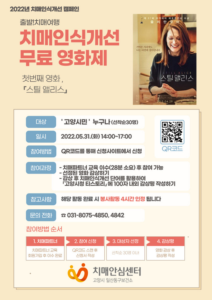 ‘출발!치매여행’은 치매 관련 영화를 통해 치매에 대한 부정적 인식을 해소하고 치매 친화적 지역사회를 조성하는 영화제 프로그램이다. 오는 5월 31일 고양관광정보센터 내 영상관에서 진행할 예정이다.