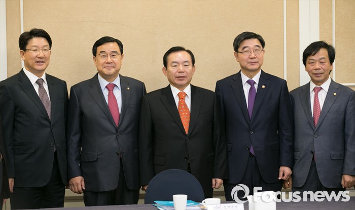 (서울=포커스뉴스) 20일 오전 서울 여의도 국회 귀빈식당에서 열린 5대 노동개혁 법안 관련 당정협의회 참석자들이 기념사진을 찍고 있다. 왼쪽부터 새누리당 권성동 의원, 김정훈 정책위의장, 이인제 노동시장선진화특위 위원장, 이기권 고용노동부 장관, 이완영 의원.