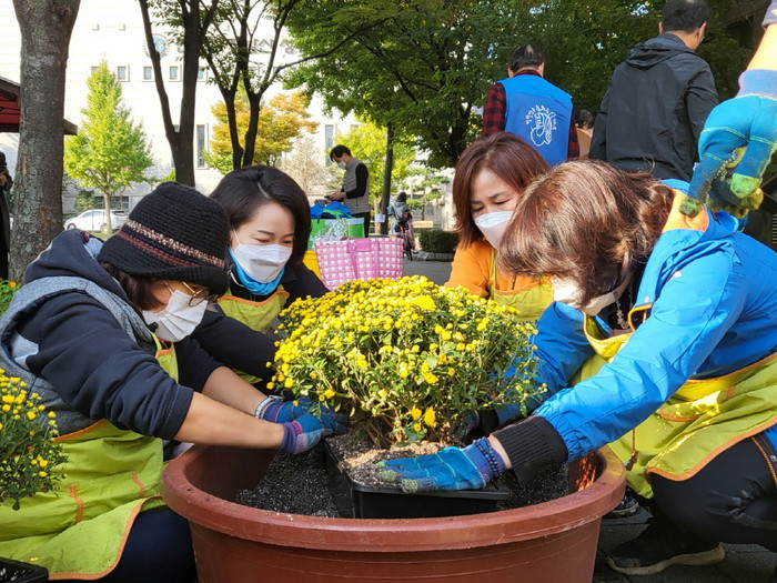 [부자동네타임즈 김인수기자] 고양시 정발산동 주민자치회(회장 진윤숙)는 지난 21일 골목 꽃길 조성사업의 일환으로 정발산동 밤가시마을 1단지~7단지 이면도로와 율동초등하교 후문 가로등과 펜스에 화분 걸이를 설치하고 국화꽃을 식재했다.