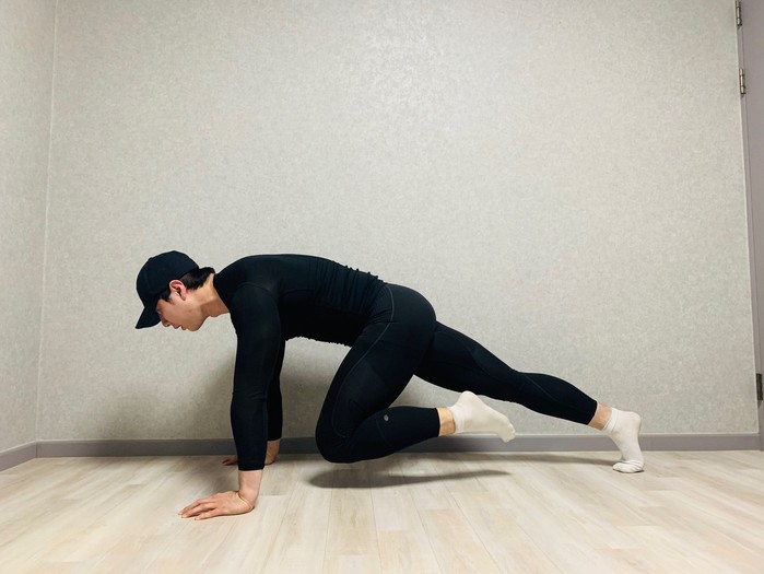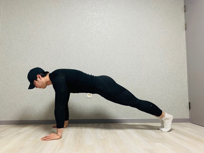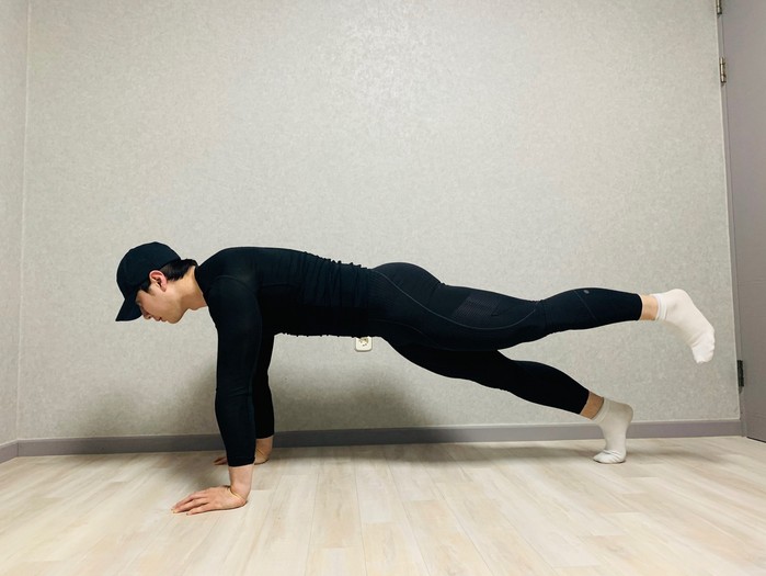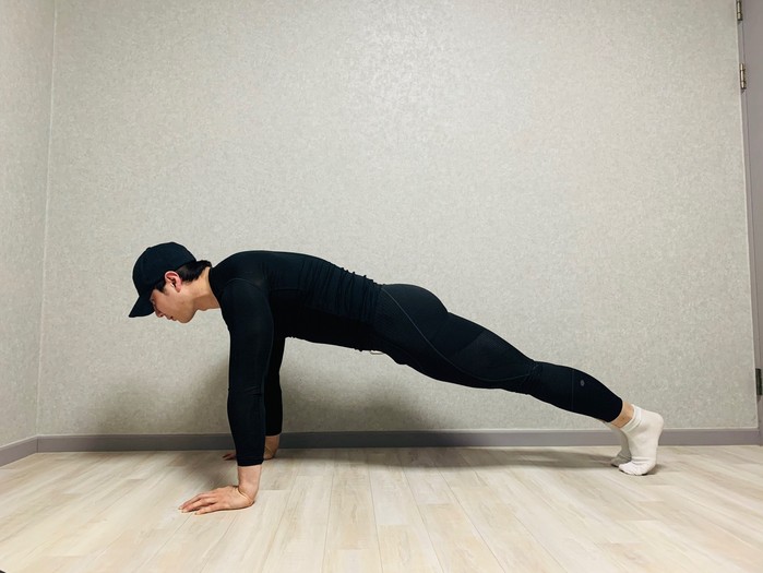 -팔굽혀펴기 자세를 취하고 시선은 대각선 하단을 바라본다.