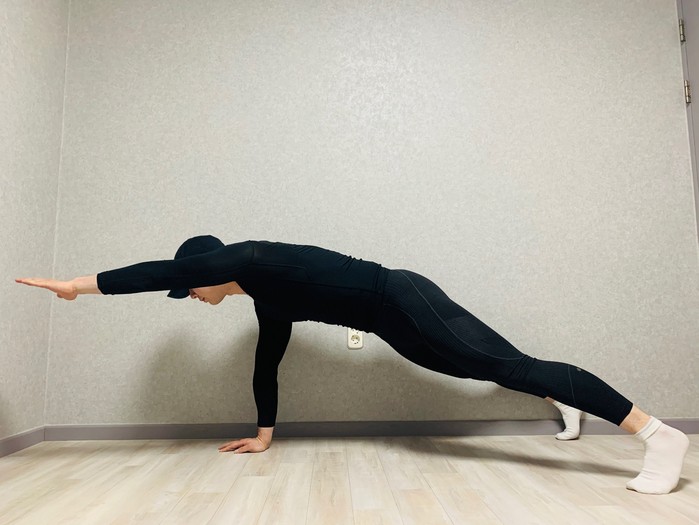 -머리부터 엉덩이까지 일직선을 유지를 해줘라, 허리가 너무 과도하게 접히면 통증을 느낄 수 있다.