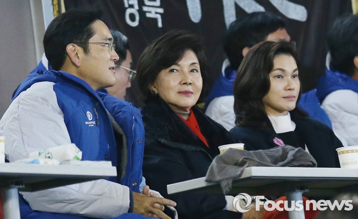 (서울=포커스뉴스) 29일 이재용 삼성 부회장과 홍라희 여사, 이서현 제일기획 경영담당 사장(사진 왼쪽부터)이 잠실구장을 찾아 삼성-두산 한국시리즈 3차전을 관전하고 있다.