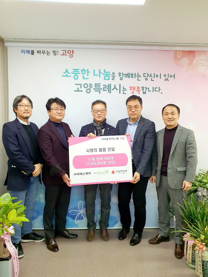 [부자동네타임즈 김인수기자] 고양특례시는(시장 이동환) 지난 2일 ㈜비에스케이, 메디푸드팜 영농조합법인에서 이웃사랑 나눔을 위해 수제밥바 약 1천개를 기부했다고 말했다.