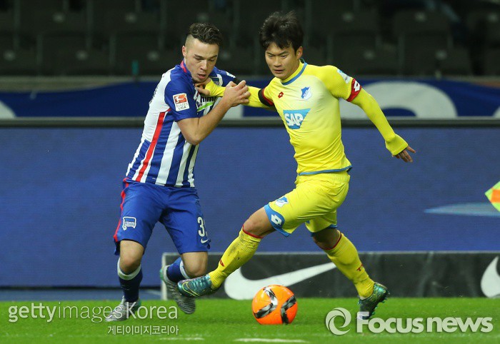 | △ <베를린/독일=게티/포커스뉴스> 독일 프로축구 분데스리가 호펜하임의 김진수(오른쪽)가 지난달 22일(한국시간) 열린 헤르타 베를린과의 경기에서 상대선수 얀니 레게젤과 볼 경합을 하고 있다. (C)게티이미지/멀티비츠 |