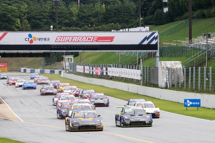 [사진설명] 용인 에버랜드 스피드웨이에서 열린 2020 CJ대한통운 슈퍼레이스 챔피언십 3라운드에서 슈퍼 6000 클래스 머신들이 결승 레이스를 시작하고 있다.