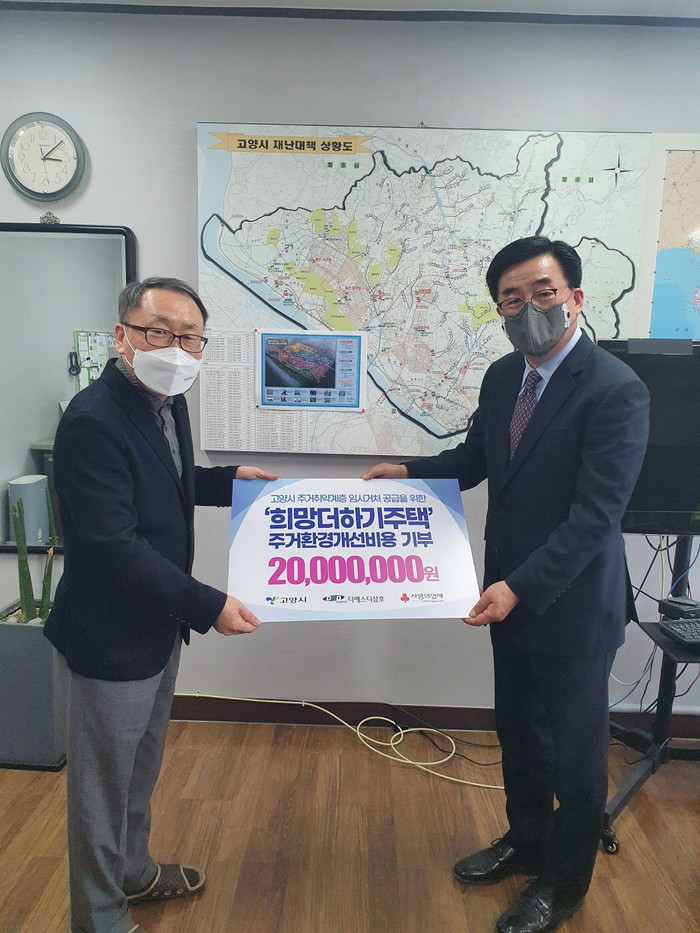 [부자동네타임즈 김인수기자] 고양시는 지난 28일 ㈜디에스디삼호가 주거취약계층의 주거환경개선을 위한 후원금 2천만원을 전달했다고 밝혔다. 후원금은 고양시 주거위기가구에 제공될 임시거처인 ‘희망더하기주택’의 리모델링비로 사용될 예정이다.
