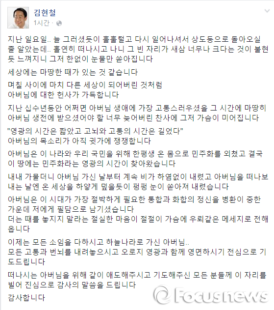 현철씨는 "지난 일요일, 늘 그러셨듯이 훌훌 털고 다시 일어나셔서 상도동으로 돌아오실 줄 알았는데 홀연히 떠나시고 나니 그 빈 자리가 새삼 너무나 크다는 것이 불현듯 느껴지니 그저 한 없이 눈물만 쏟아집니다"라고 심경을 토로했다.