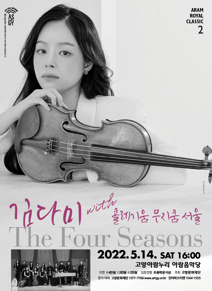 [부자동네타임즈 김인수기자] 고양문화재단(대표이사 정재왈)은 2022 아람 로열 클래식 시리즈 두 번째 공연으로 김다미 with 콜레기움 무지쿰 서울 ‘The Four Seasons’을 5월 14일(토), 고양아람누리 아람음악당에서 선보인다. 이번 프로그램은 풍부한 질감, 진지한 연주로 독자적인 팬덤을 형성해가고 있는 바이올리니스트 김다미와 고(古)음악 전문 연주단체 콜레기움 무지쿰 서울의 협연으로 선보이는 비발디와 피아졸라의 ‘사계’이다.