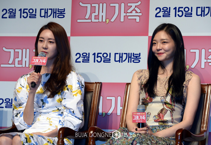 배우 이요원(왼쪽)과 배우 이솜이 25일 오전 서울 강남구 CGV 압구정점에서 열린 영화 '그래, 가족' 제작보고회에 참석해 취재진의 질문에 답하고 있다. 2017.01.25