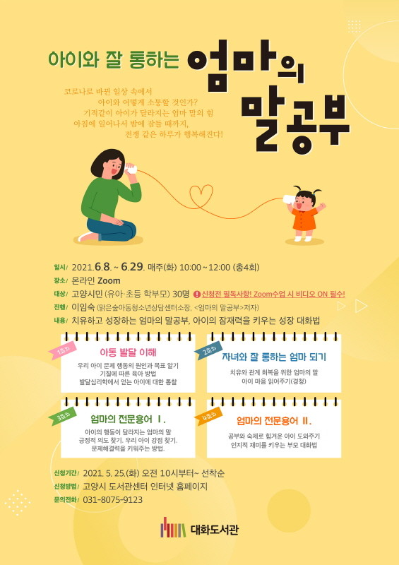 [부자동네타임즈 김인수기자] 고양시 대화도서관은 부모와 자녀가 올바르게 소통할 수 있도록 돕는 부모교육 프로그램 ‘엄마의 말공부’를 6월 8일부터 운영한다.