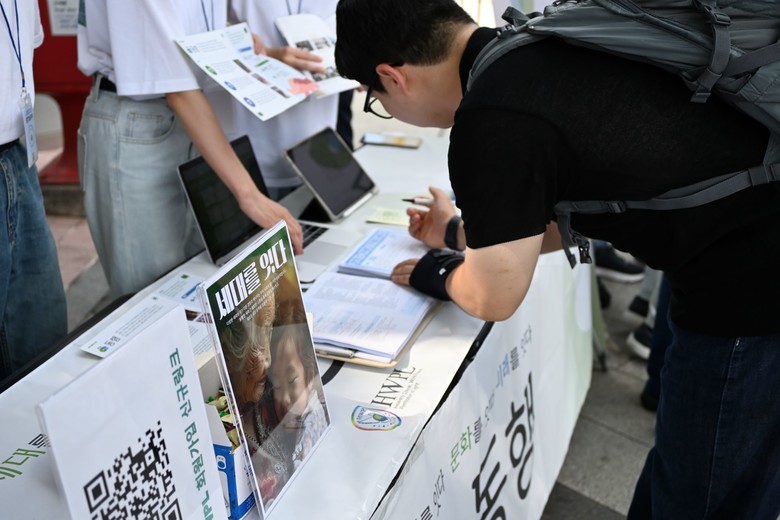 | ▲지난 7일 영등포역 부근에서 열린 동행 캠페인 홍보부스에서 HWPL 글로벌 08지부 봉사자가 시민에게 캠페인에 대해 설명하고 있다. [사진 제공 = HWPL 글로벌 08지부] |