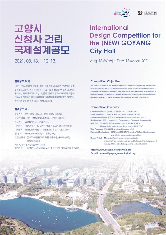 고양시 신청사 건립 국제설계공모는 일반 설계공모로 진행되어 국내외 건축가 누구나 참여할 수 있으며, 외국 건축가인 경우 국내 건축가와 공동으로 응모해 참여 가능하다.