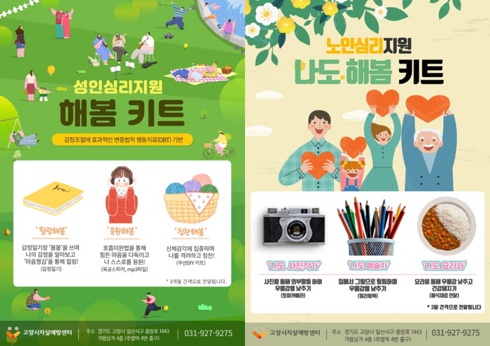 비대면 자살예방서비스 확대의 일환으로 마련된 「해봄 심리지원키트」는 성인용과 노인용 두 가지로 구성되어 있으며 격월로 3회 제공된다.